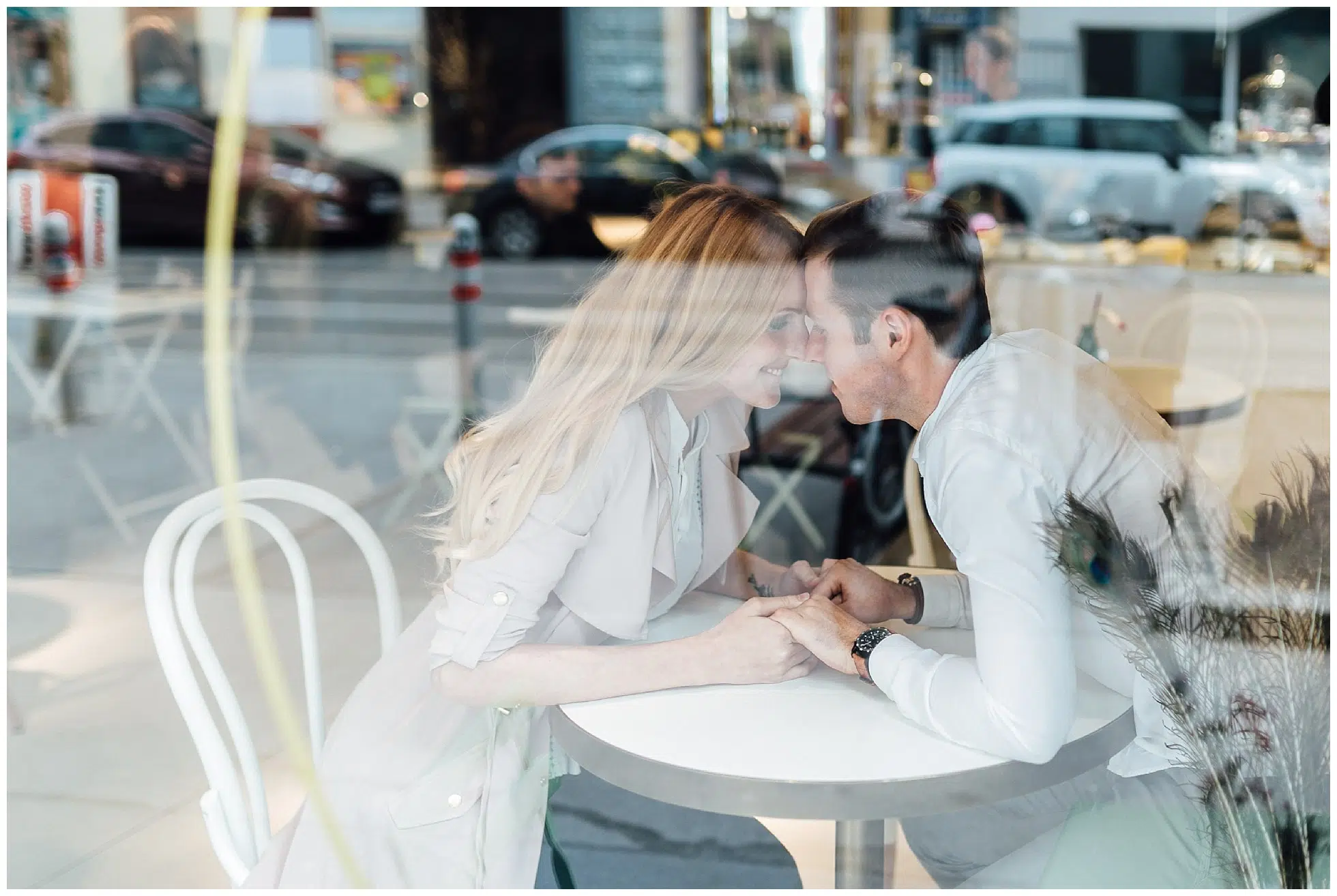Verliebtes Paar durch die Scheibe eines Cafés fotografiert