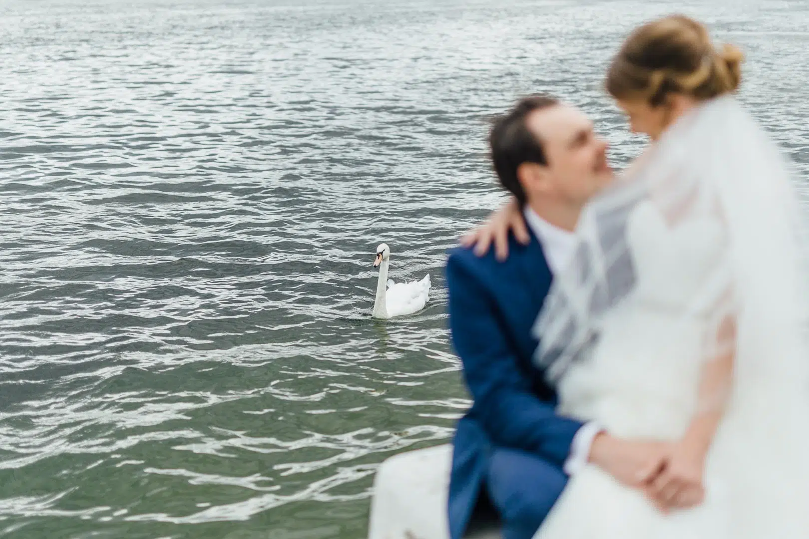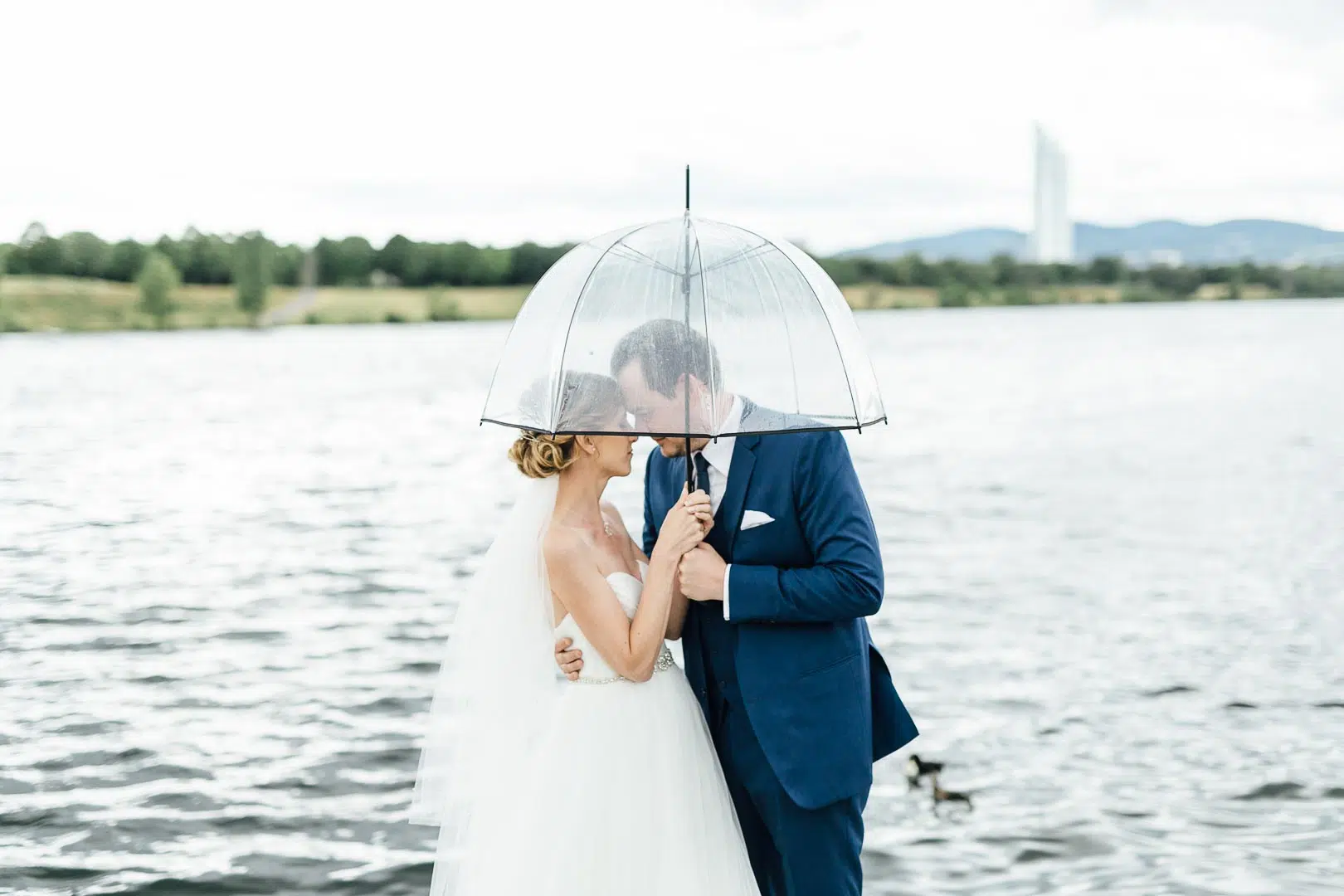 Maria und Bernhardt wohnen praktischerweise ganz nah an der Donau, so dass wir ihre wunderbaren Hochzeitsbilder gleich am Wasser machen konnten. Wasser kam auch (kurzfristig) von oben. Zum Glück hatte ich meinen shootingtauglichen Regenschirm dabei und Frisur und Make Up waren gerettet!